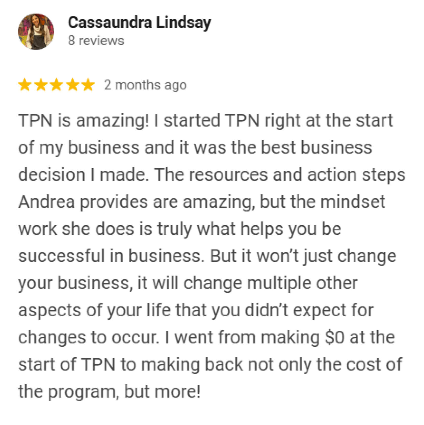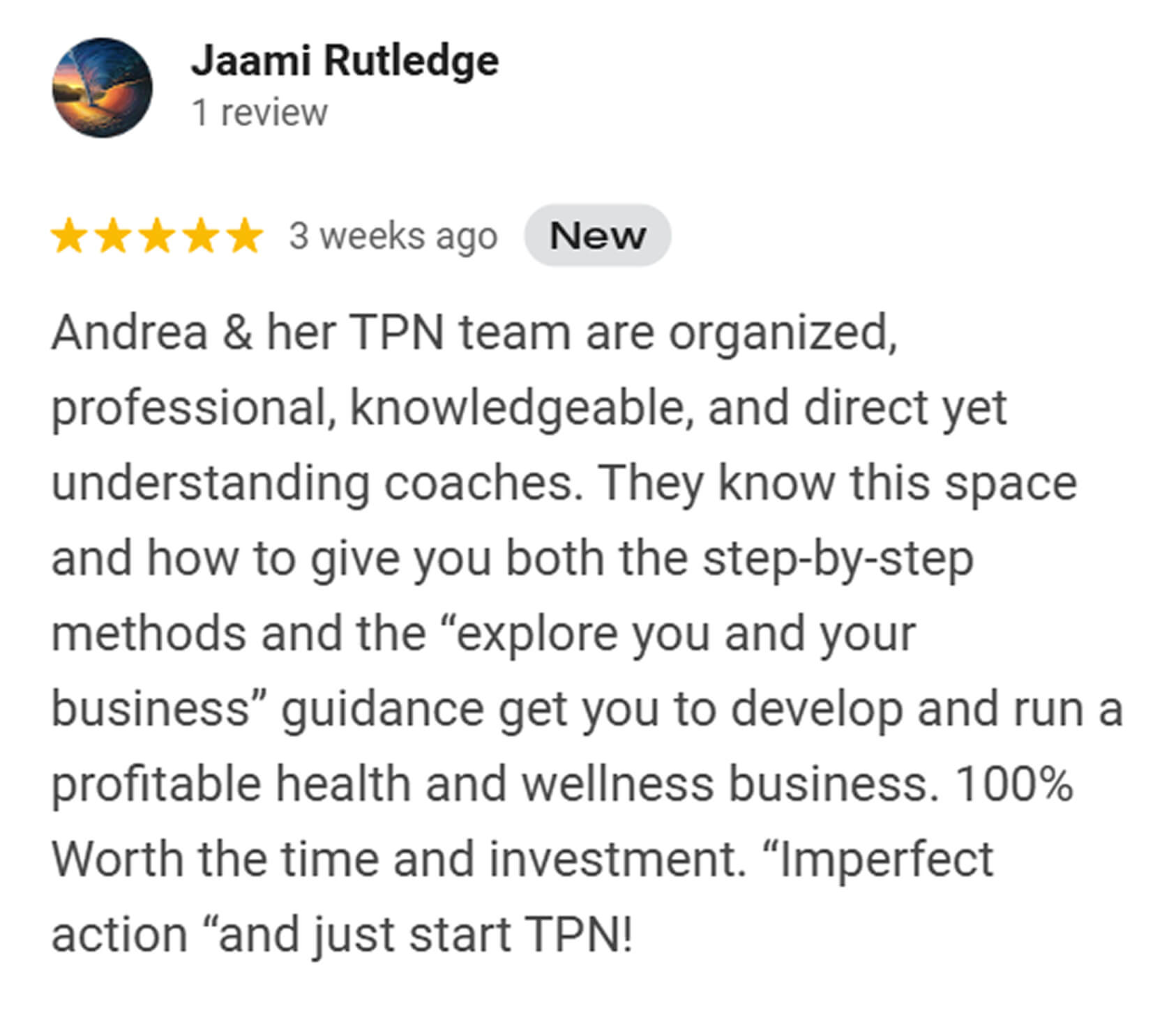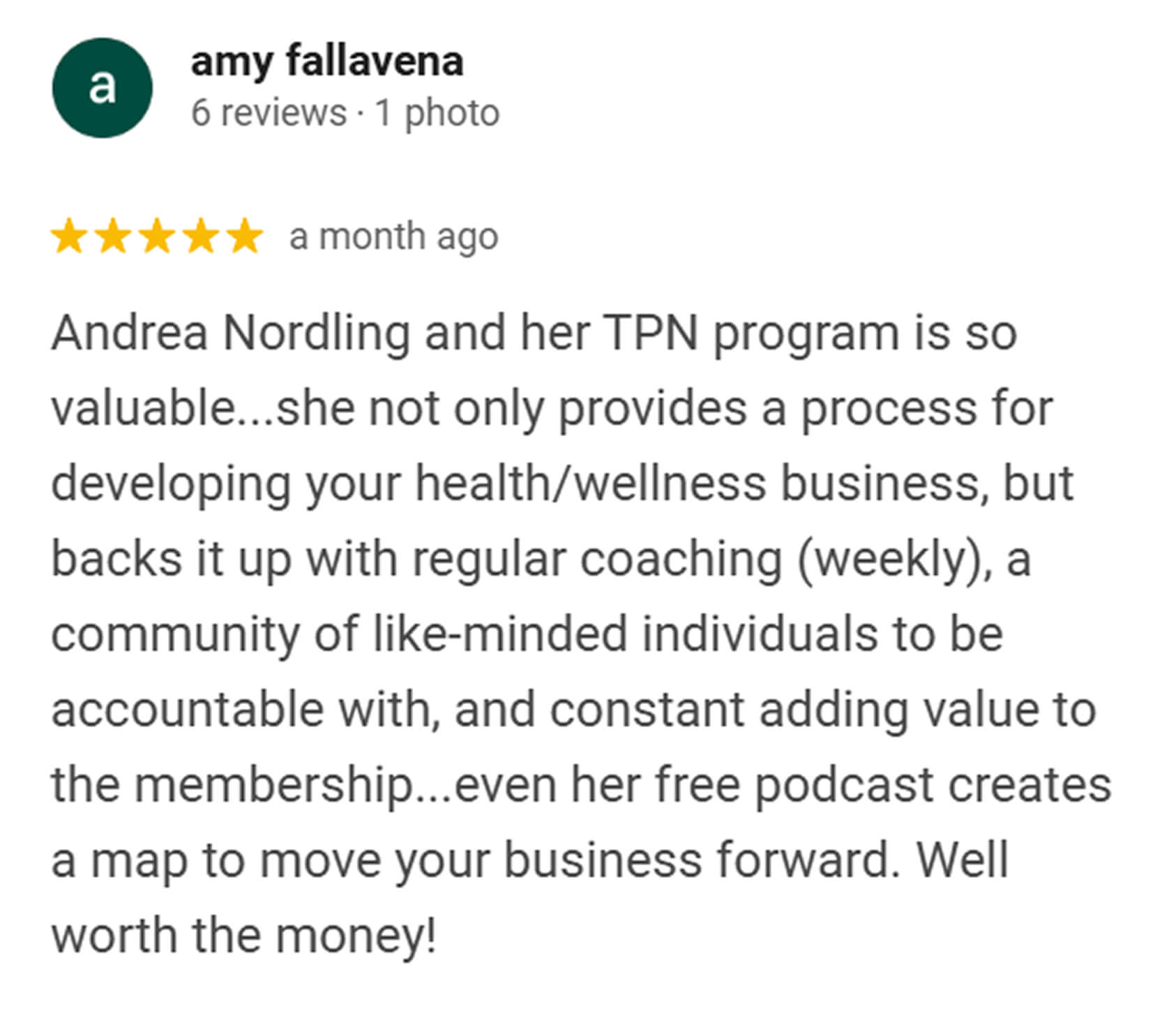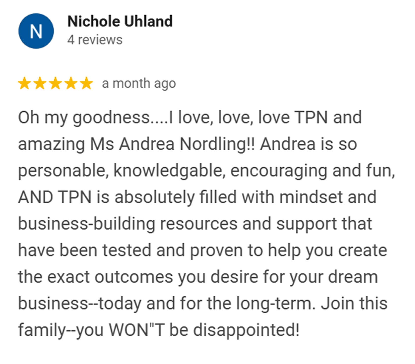 “TPNs modules, trainings, and weekly coaching are amazing! I followed Andrea’s teachings, got my website up, payment set up, and got my first client!“