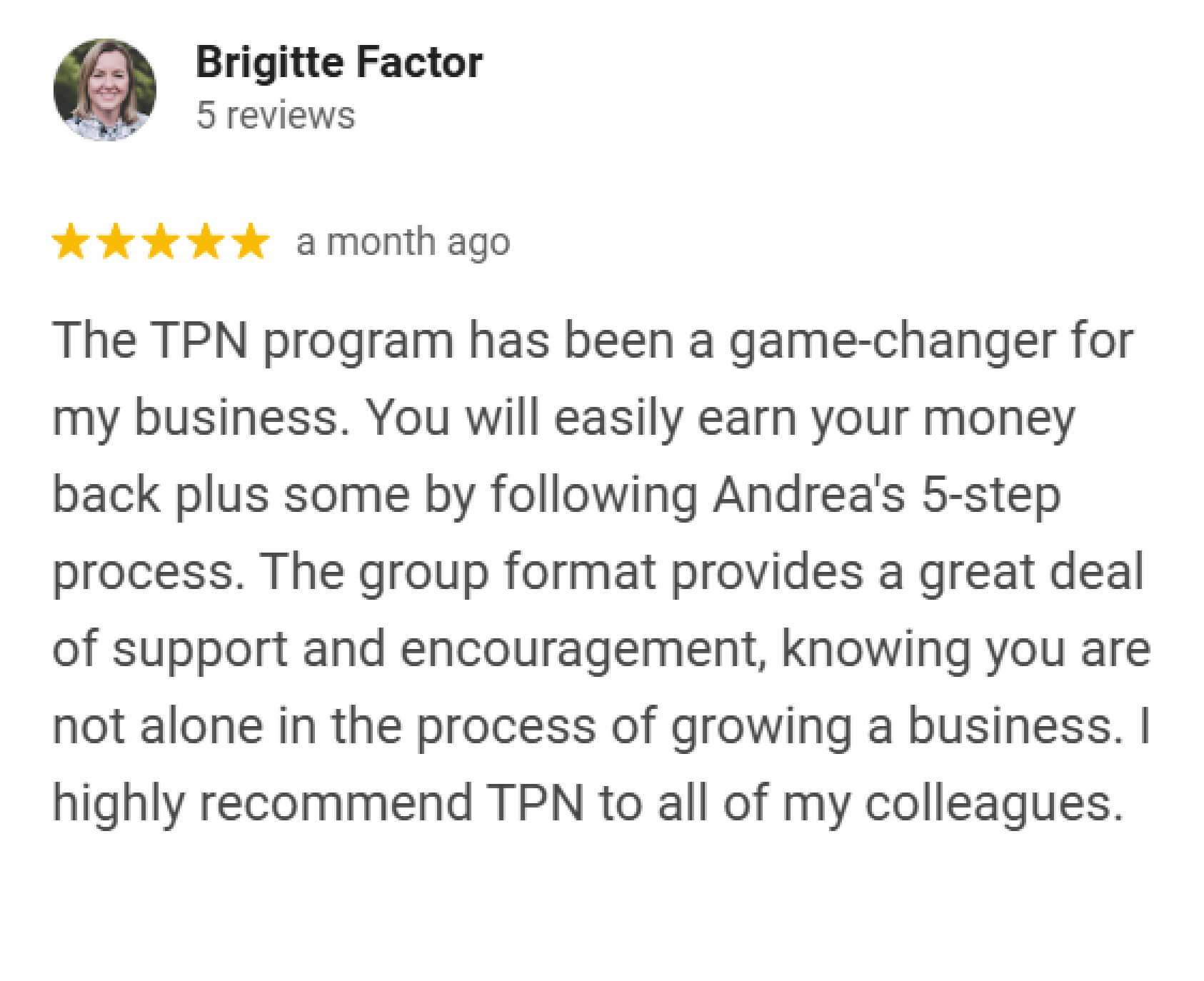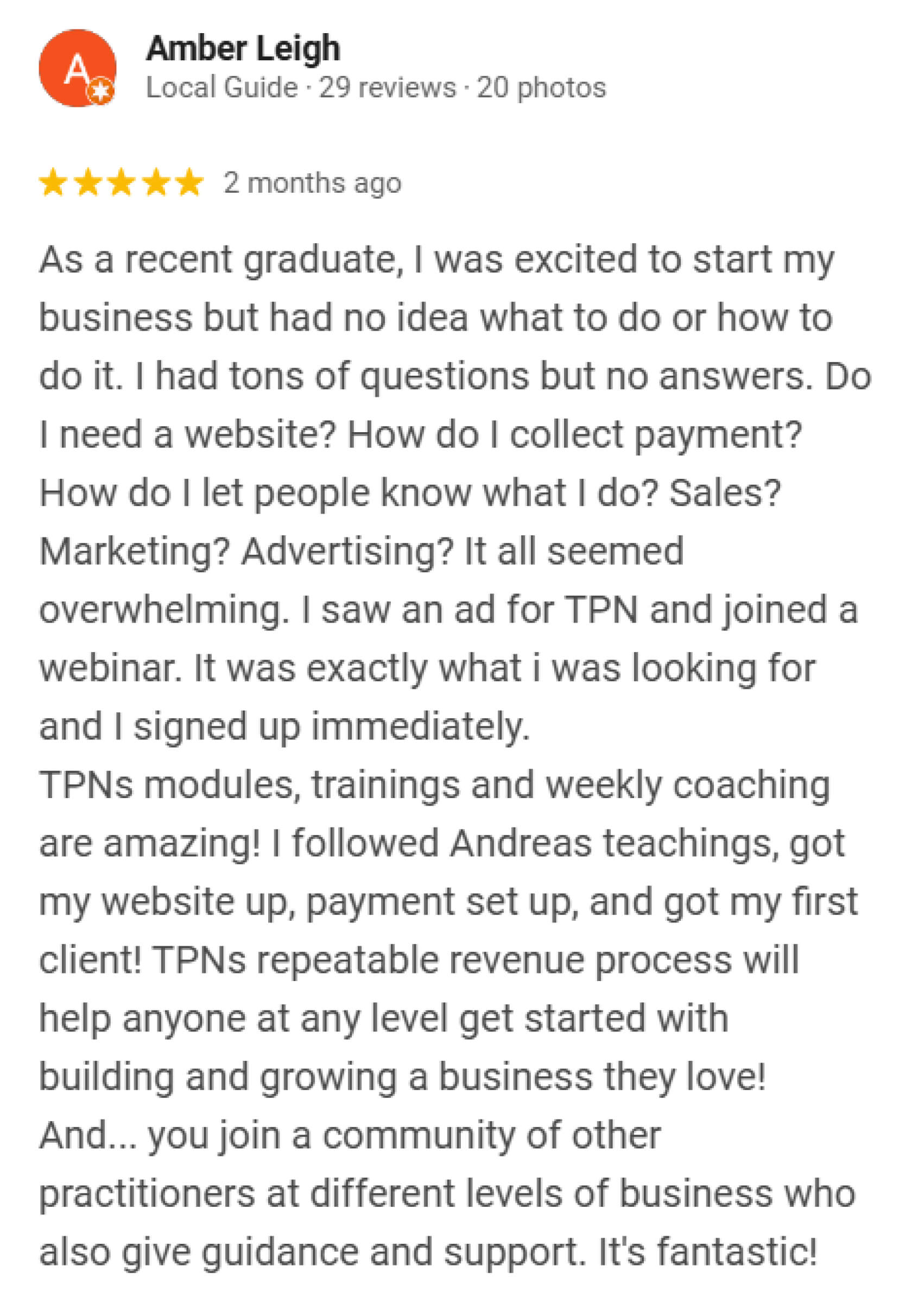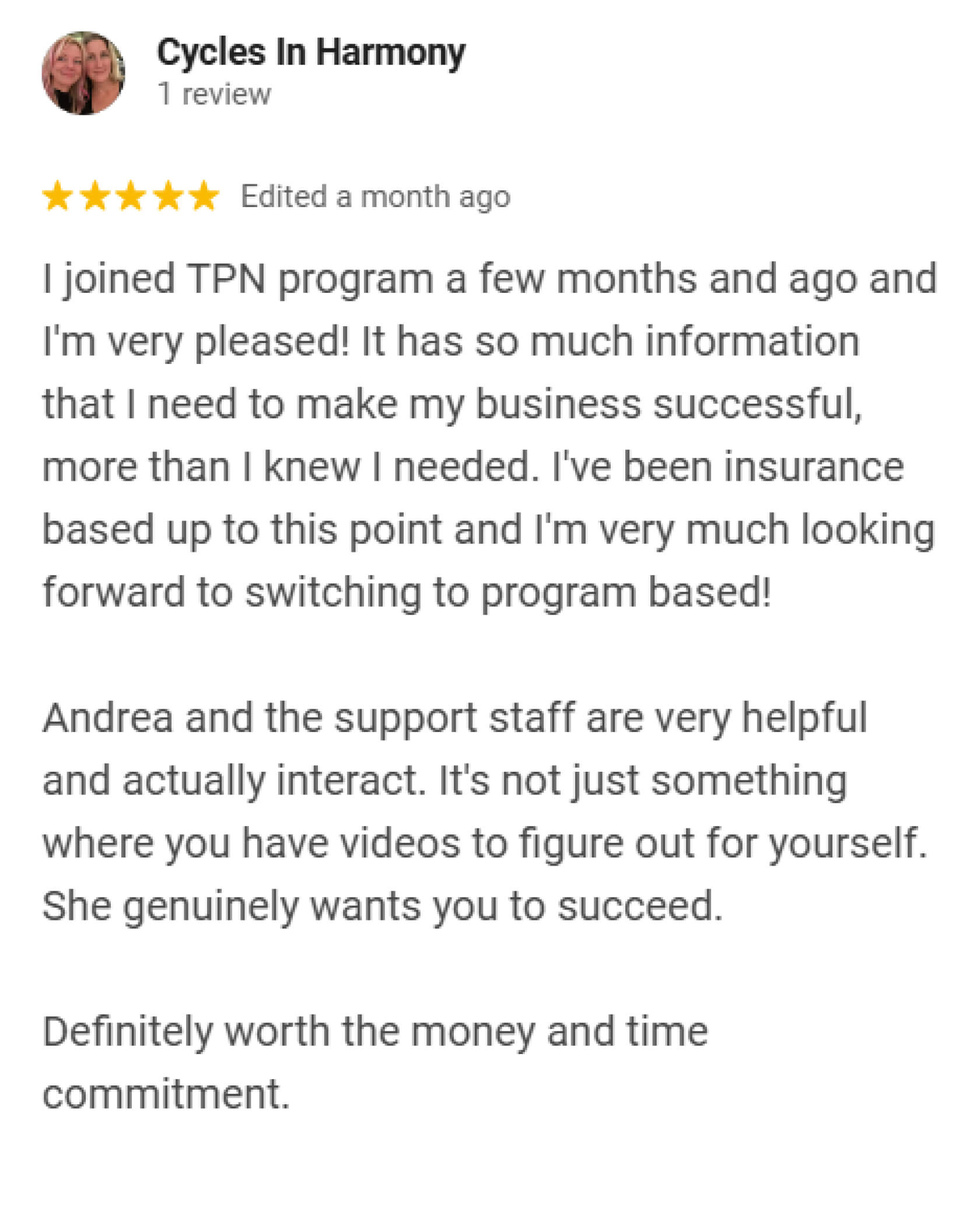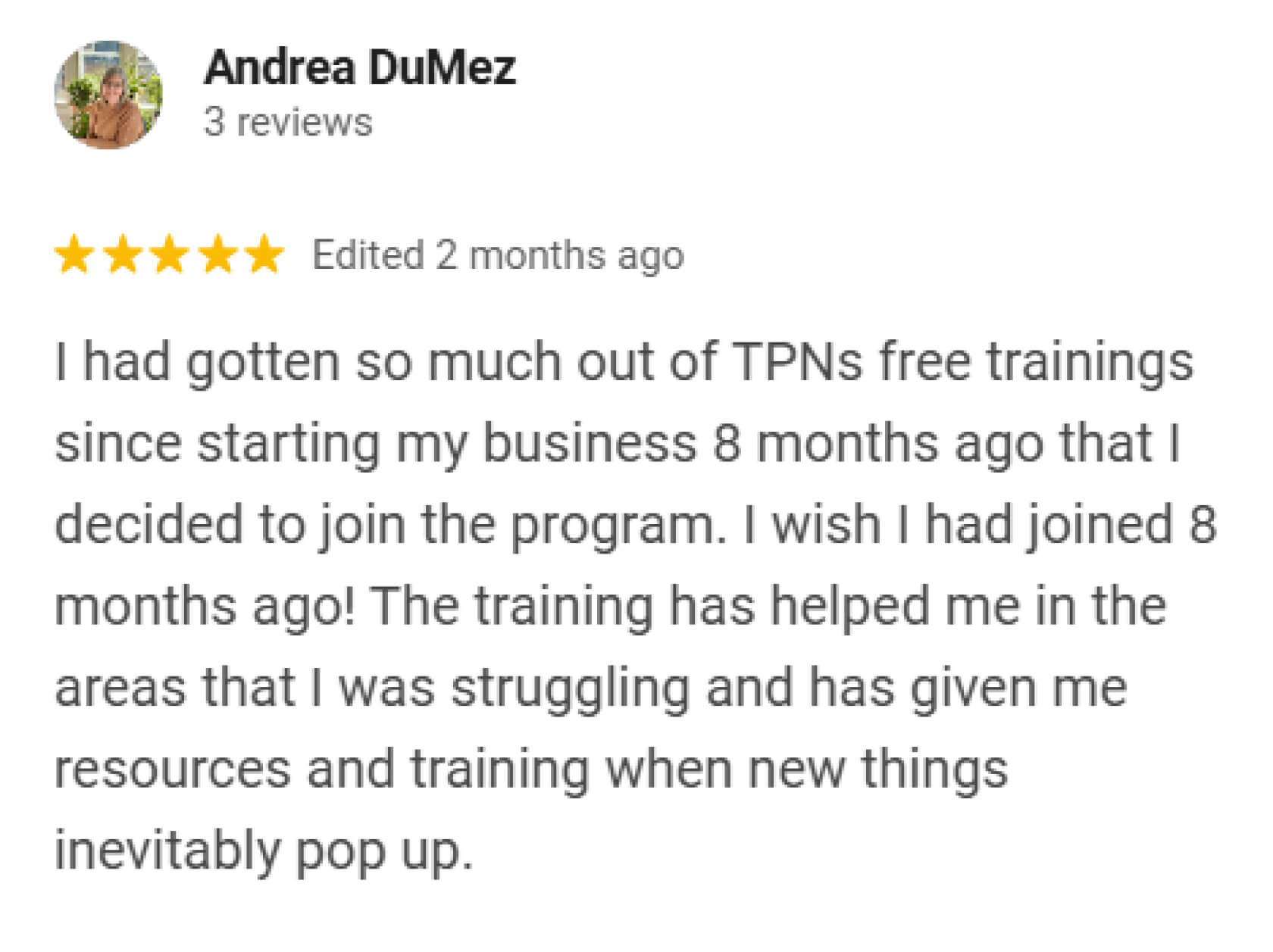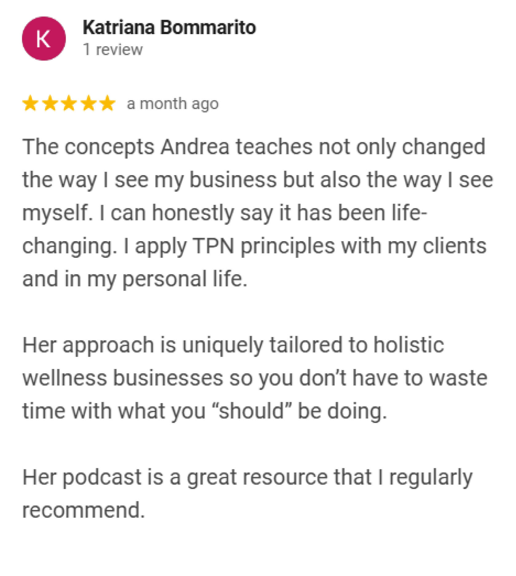 “TPNs modules, trainings, and weekly coaching are amazing! I followed Andrea’s teachings, got my website up, payment set up, and got my first client!“