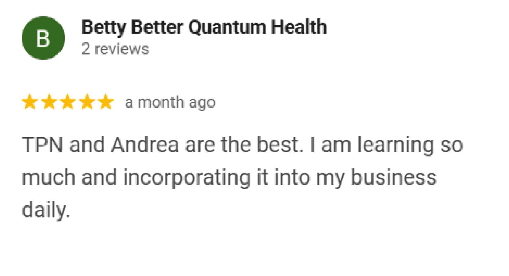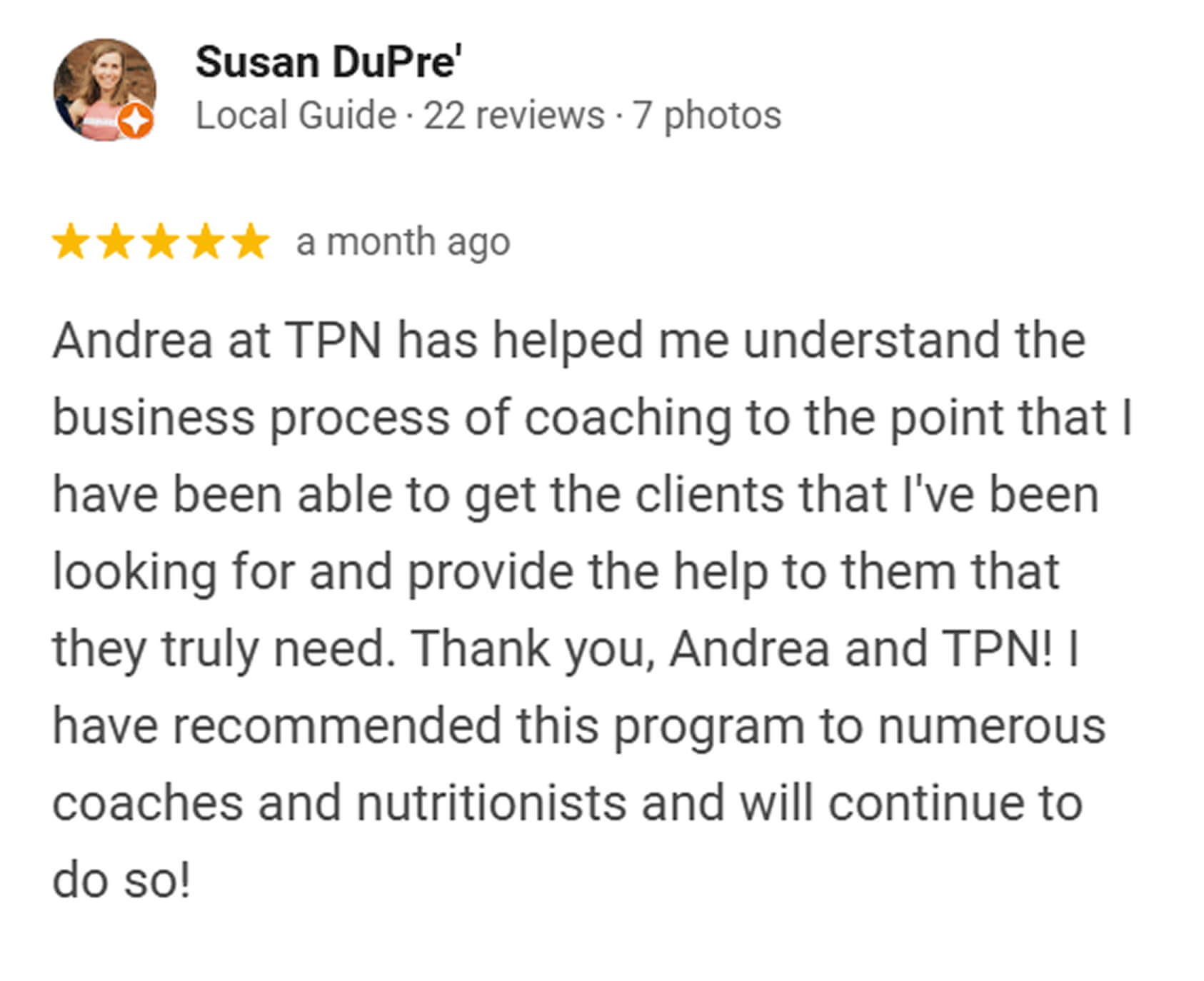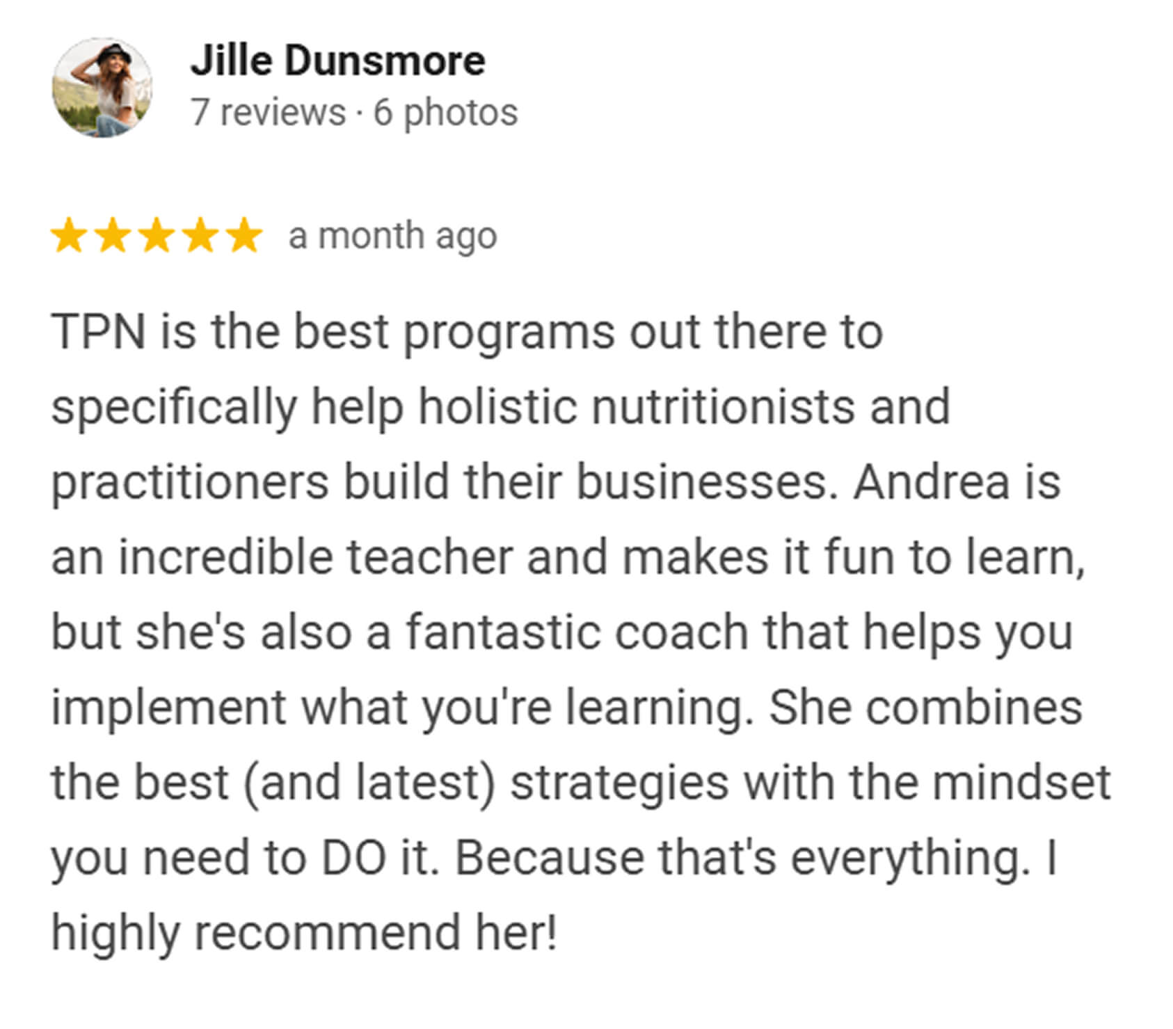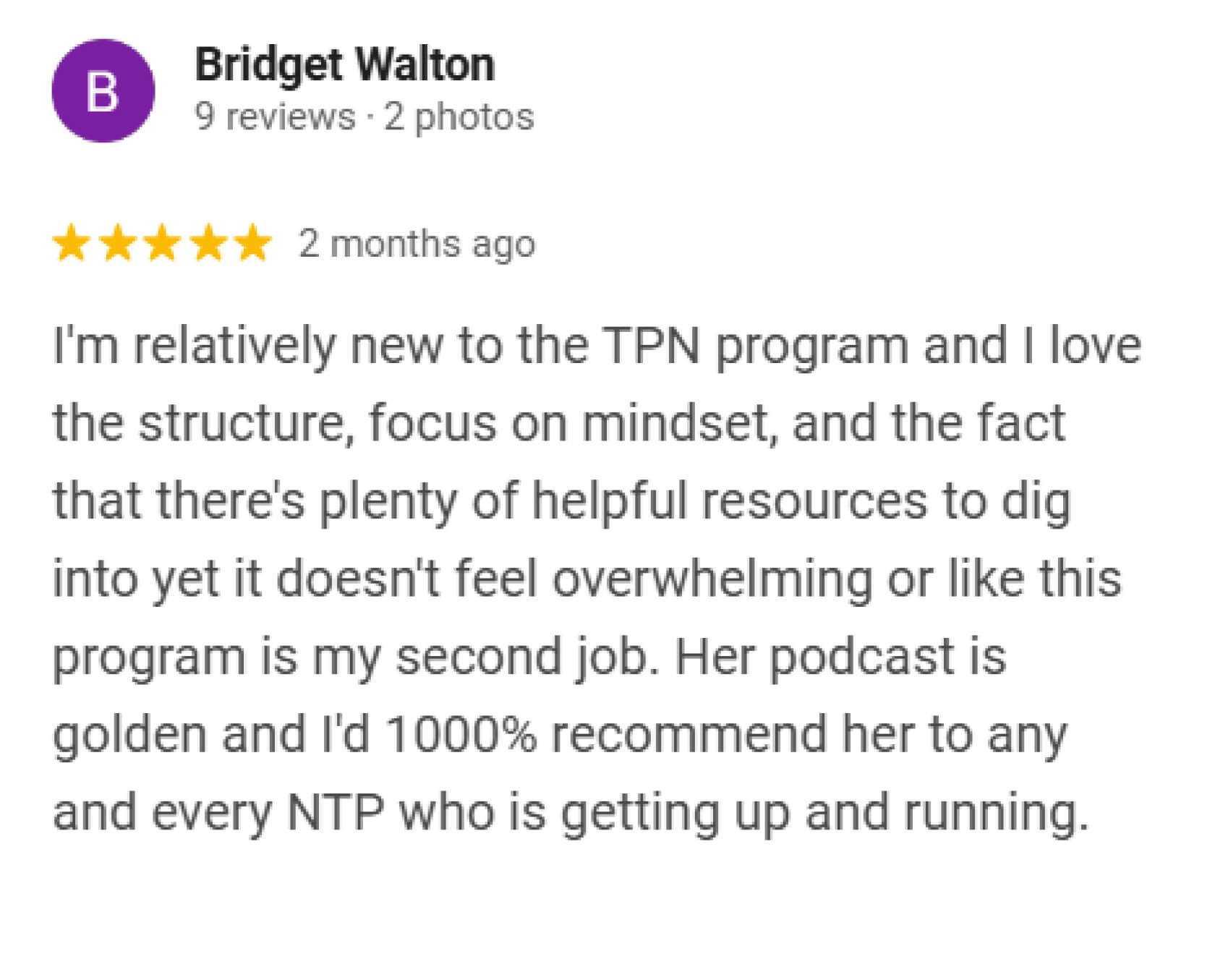 “TPNs modules, trainings, and weekly coaching are amazing! I followed Andrea’s teachings, got my website up, payment set up, and got my first client!“