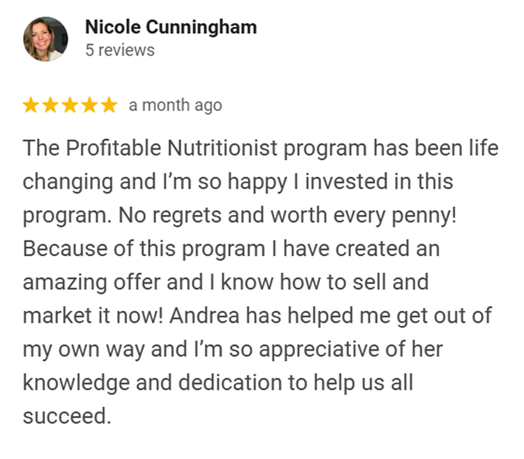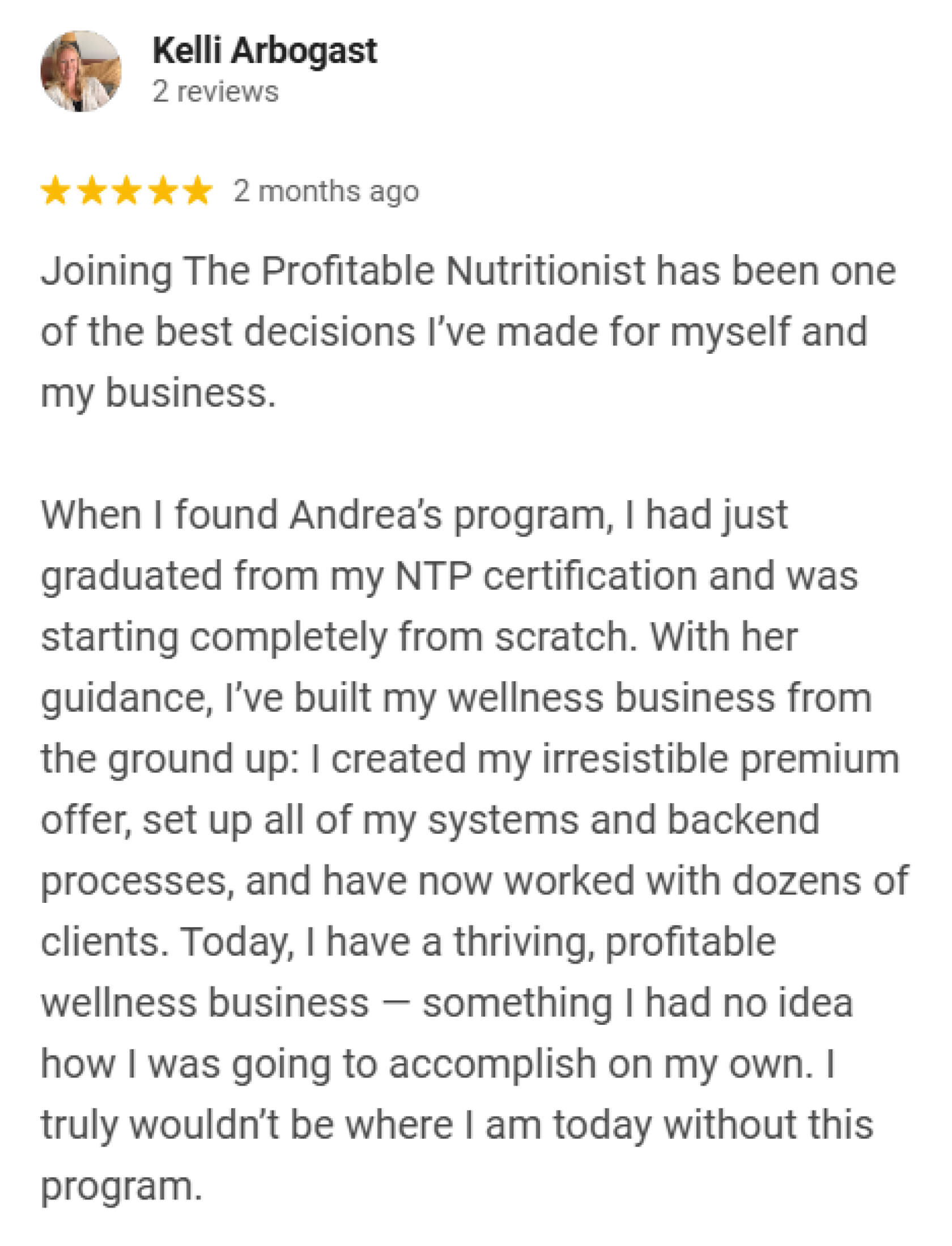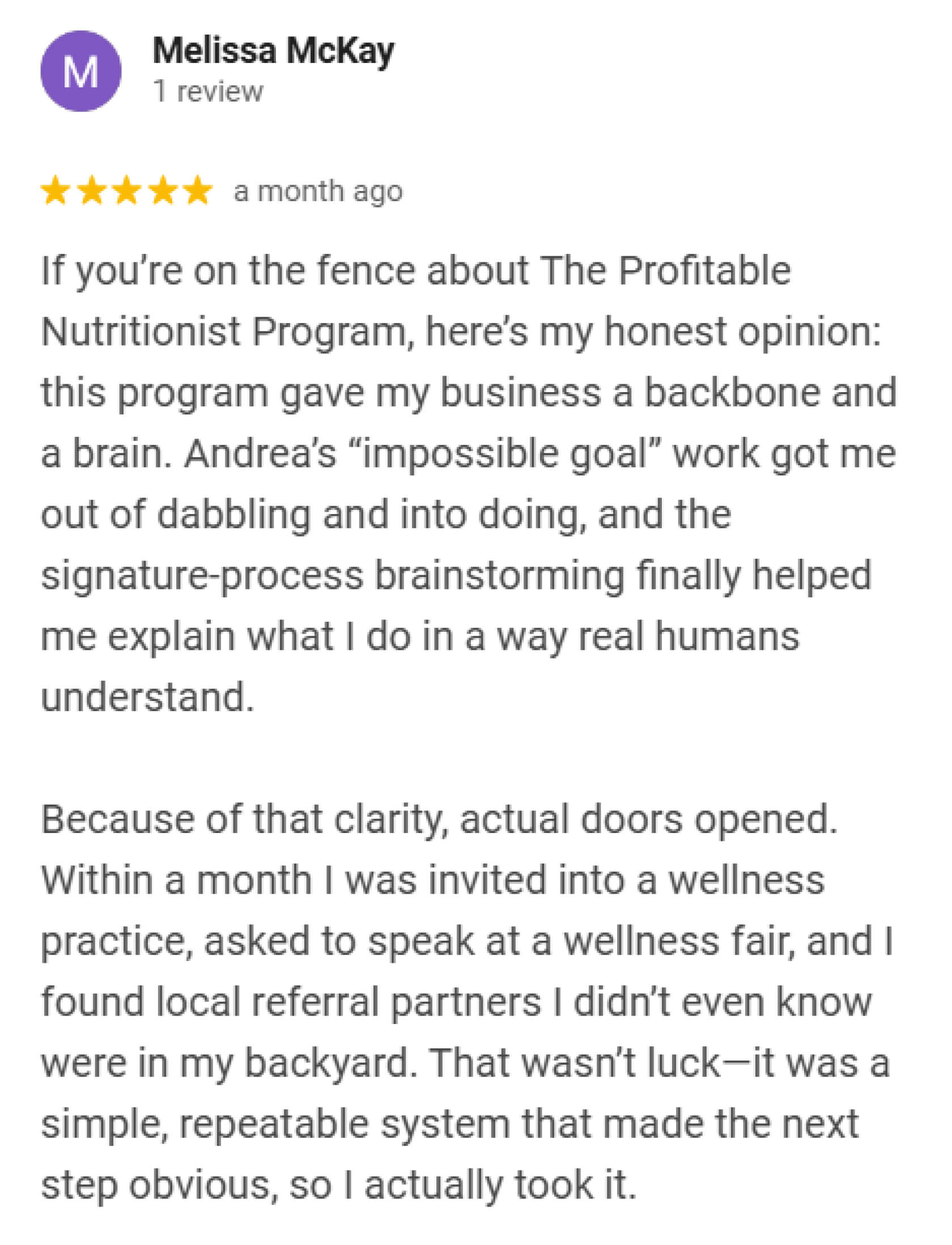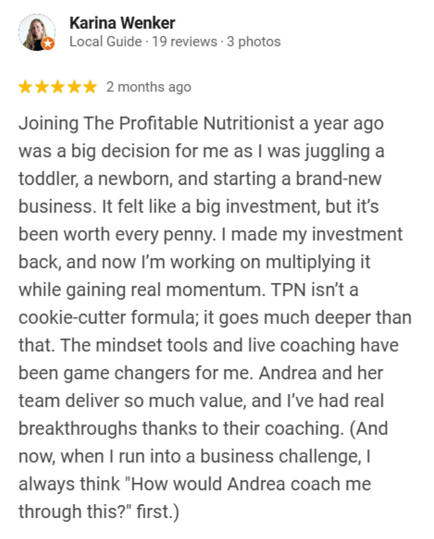 The Profitable Nutritionist® Program works. It gives you the structure, strategy, coaching, and community to build a business that gives you more freedom and meaning in your life.