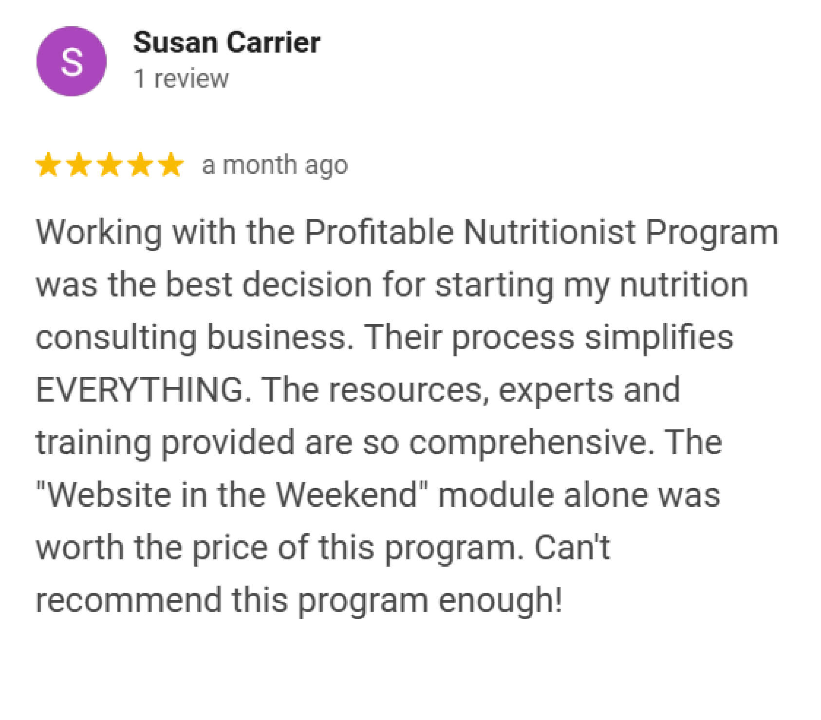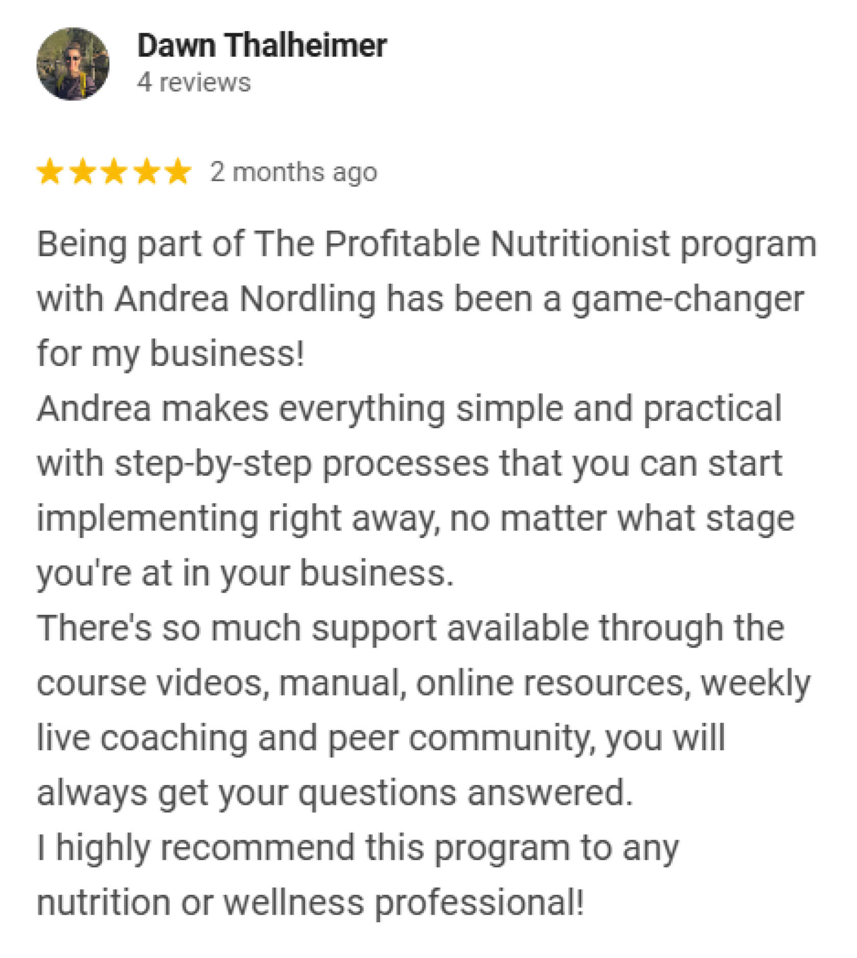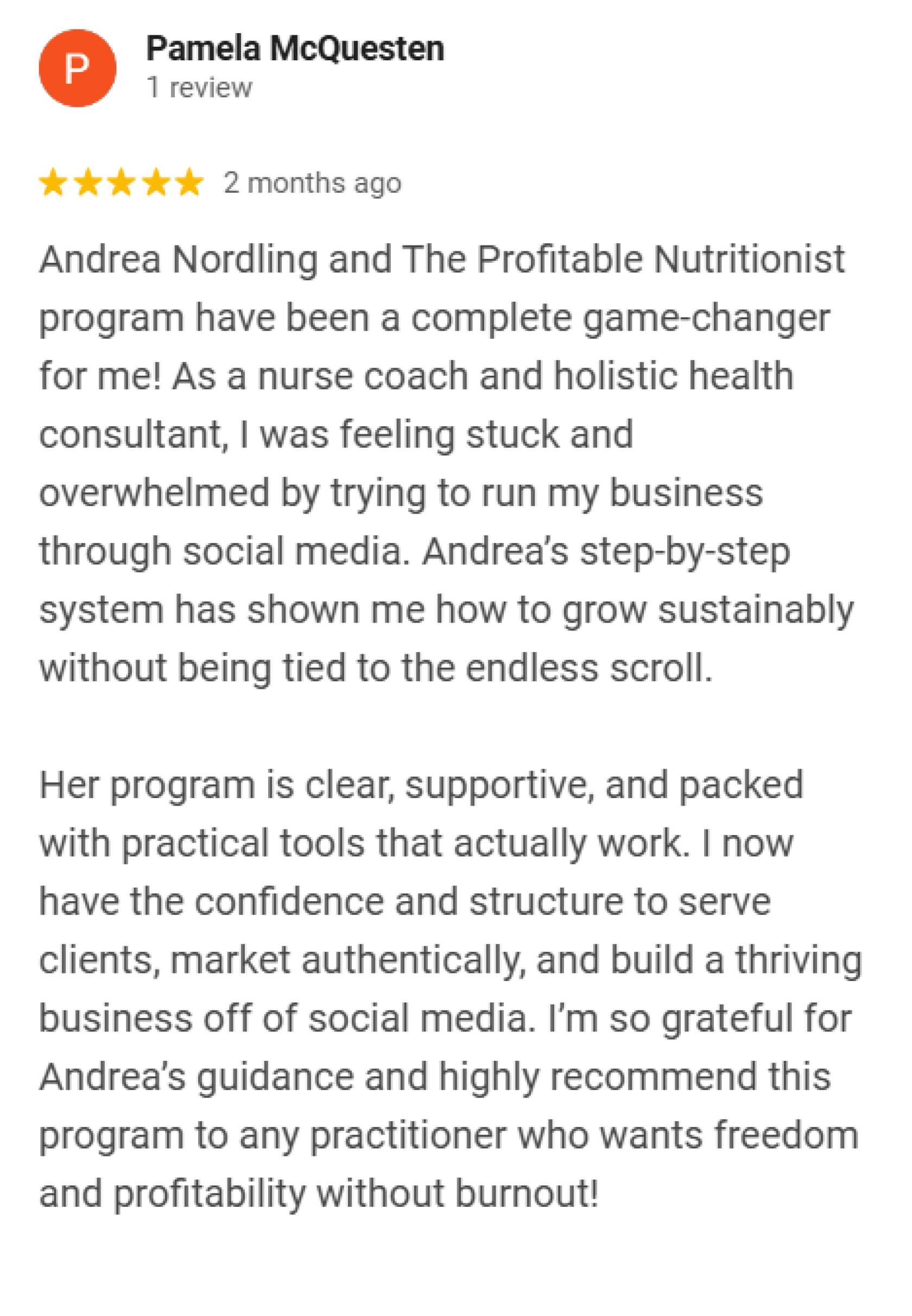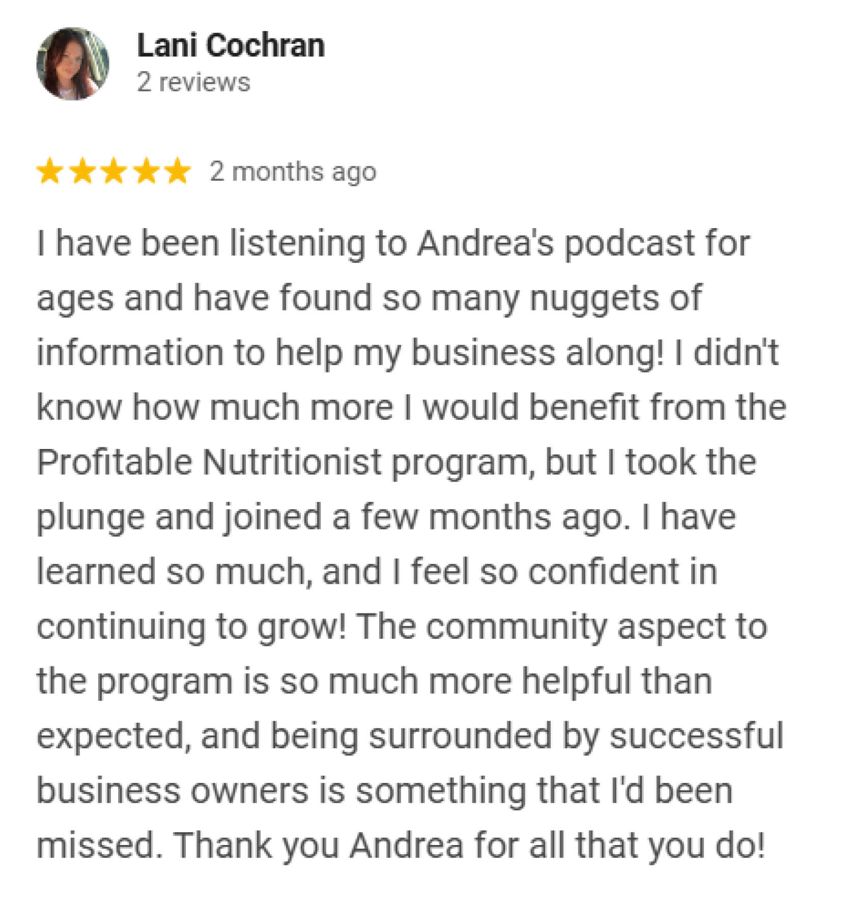 The Profitable Nutritionist® Program works. It gives you the structure, strategy, coaching, and community to build a business that gives you more freedom and meaning in your life.