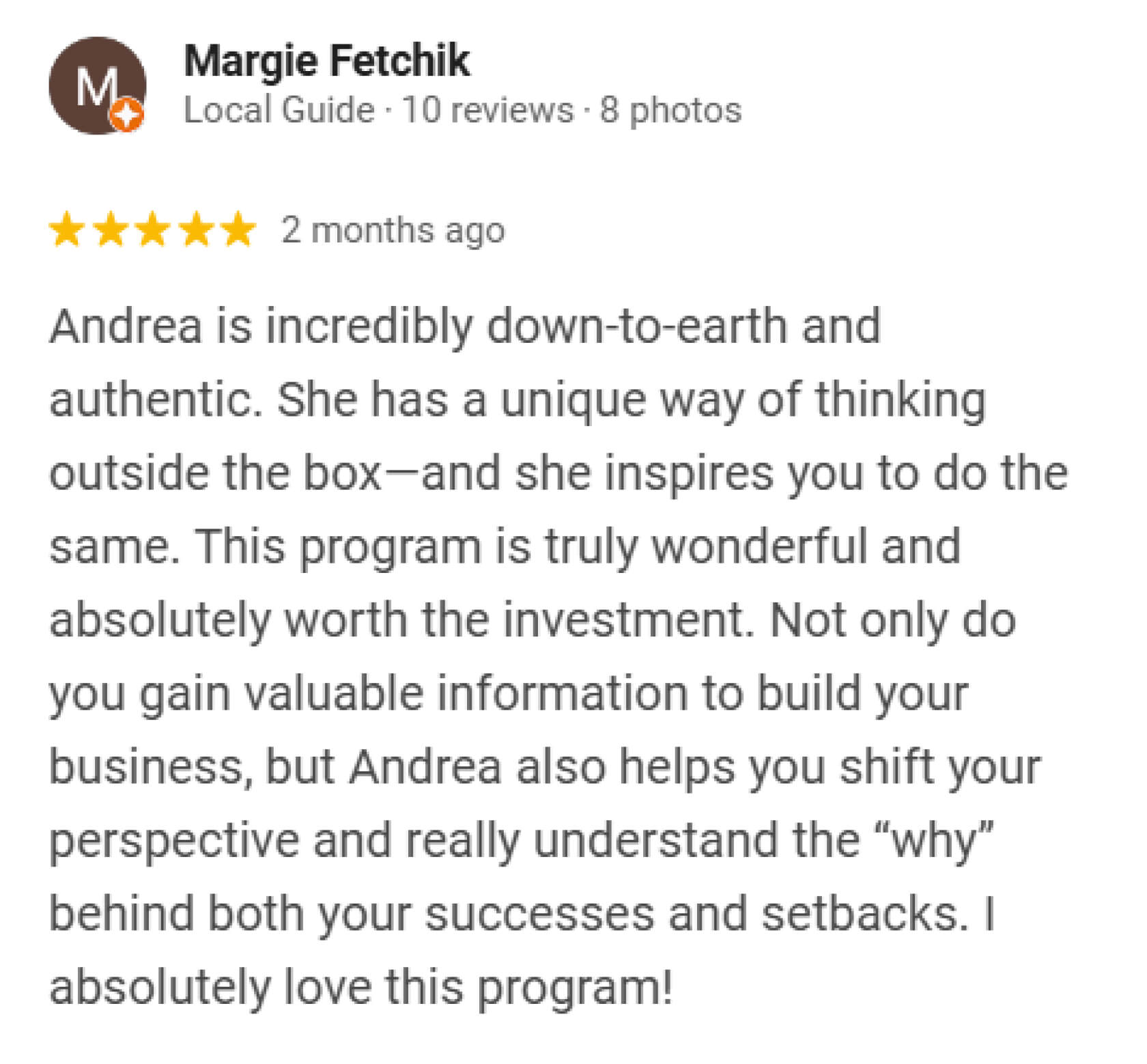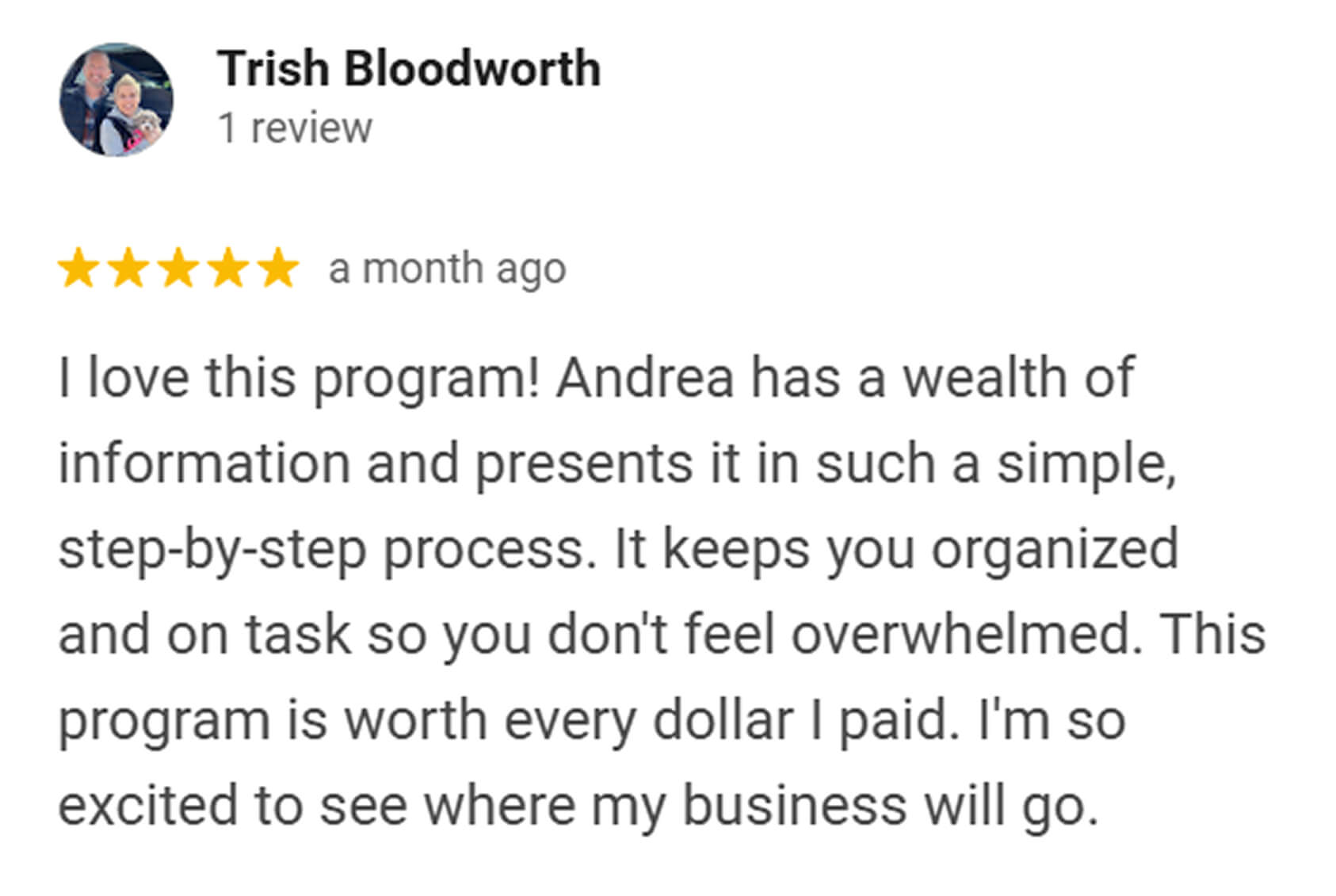 “I love this program! Andrea has a wealth of knowledge and presents it in such a simple, step-by-step process. It keeps you organized and on task so you don’t feel overwhelmed. This program is worth every dollar I paid.“