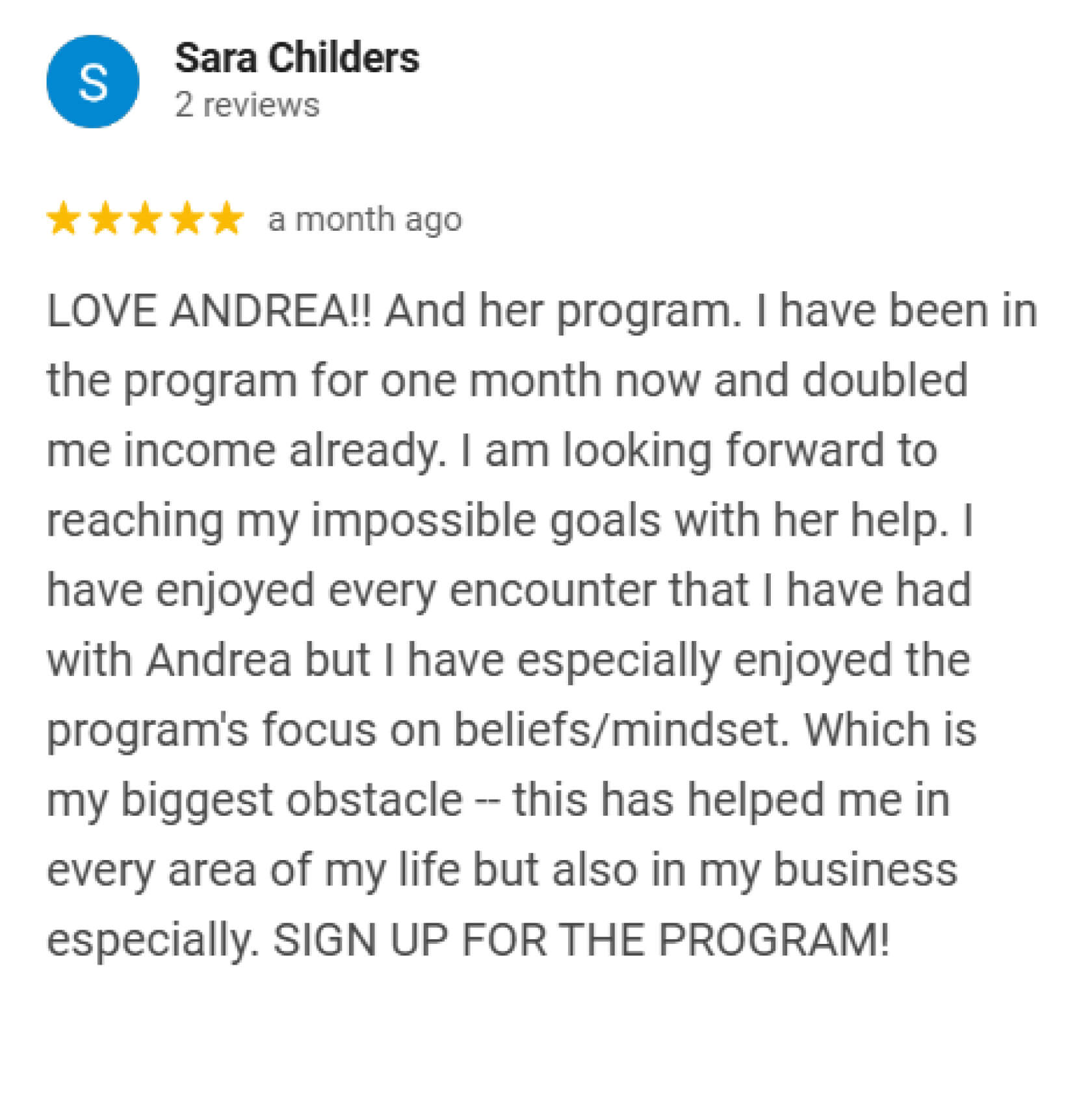 “Andrea and this program have provided all the information, encouragement, support, coaching and mentorship I needed to go from one or two clients here and there to signing over 10 clients back-to-back in my newly formed 4-month program!”